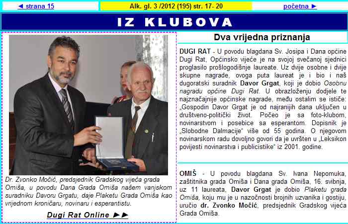 Priznanje Grgatu od strane općine Dugi Rat, 2012. Loka premio al Grgat de la komunumo Dugi Rat, en 2012