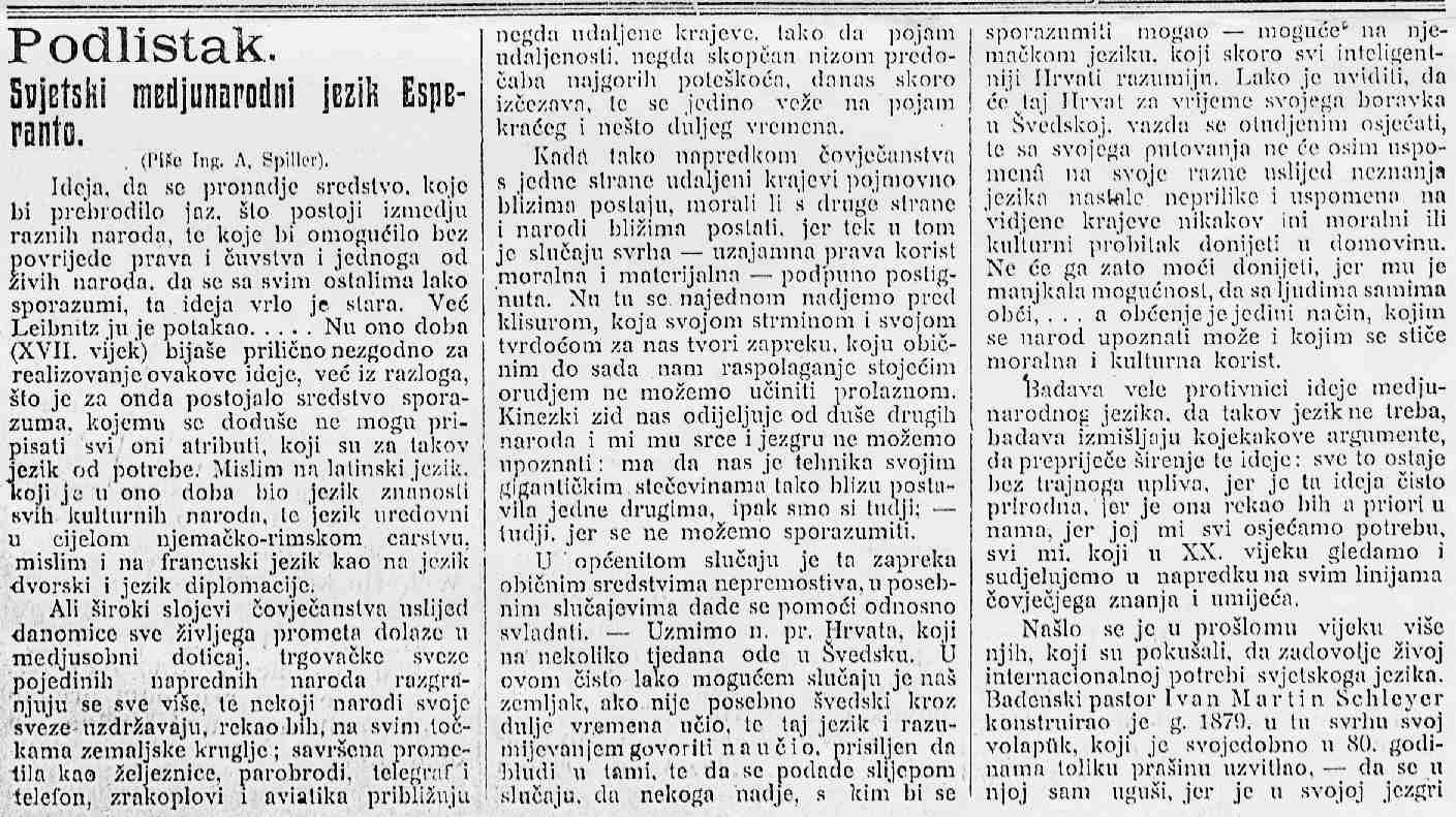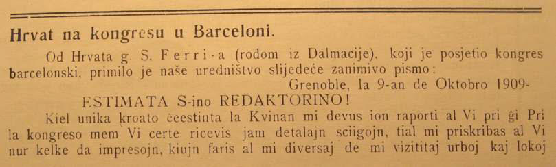 La teksto kiun pri Esperanto li publikigis jam en 1909 en la gazeto "Hrvatske
