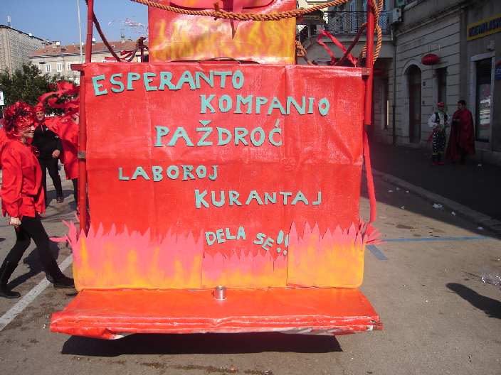 Esperanto društvo Rijeka već je treći put za redom nastupilo u karnevalskoj povorci na međunarodnom karnevalu u Rijeci. Skupina nastupa pod imenom "ESPERANTO-MASKERADA KOMPANIO PAŽDROĆ". Ovu godine 22. veljače u povorci maškara sudjelovalo je više od 8.000 maškara. Povorka maškara trajala je dulje od 6 sati, od 12 do 18 sati. Kao i svake godine, maškaranu povorku promatralo je mnoštvo gledalaca. Procjene su da je ove godine povorku gledalo oko 120 tisuća gledalaca. Bio je krasan sunčani dan, pa se i tome može zahvaliti što je povorku promatralo ovoliki broj gledatelja. Sa svojom maškaranom grupom Esperantsko društvo Rijeka predstavilo se širokoj publici. Ime grupe je "Paždroć", što na hrvatskom čakavskom narječju znači "svega i svačega". Najsličnija riječ ovoj bila u kajkavskom narječju "ćušpajz" dok ova riječ na esperantu glasi "tohuvabohuo". Ova riječ paždroć slična je i u lokalnom talijanskom dijalektu koji pripada talijanskom narječju veneto, a u Rijeci je za taj dijalekt uobičajen naziv "fiumanski". U tom dijalektu riječ glasi "pasdrocio". Ove godine skupina je izabrala za karnevalski nastup naziv "PADELA" To je riječ iz hrvatskog čakavskog narječja, a u sjevernim hrvatskim narječjima poznata je pod imenima "šerpa" ili "rajngla". Riječ "padela" nalazi se i u talijanskim dijalektima pa tako i u "fiumanskom" (riječkom). Ta se posuda za kuhanje ručka na esperantu zove "kaserolo". U skupini je bilo oko 40 maškaranih učesnika, a imali su i velika alegorijska kola. Na alegorijskim kolima bila je izrađena velika "PADELA" u kojoj bi se trebao kuhati "paždroć". Ime skupine na esperantu ESPERANTO-MASKERADA KOMPANIO "PAŽDROĆ" bilo je vidljiva na dvije strane alegorijskih kola, pa se je tako esperantska skupina predstavila pred 120.000 gledatelja. Članovi skupine su esperantisti, neesperantisti i pripadnici talijanske manjine. Esperantsko društvo će na karnevalskoj povorci sa svojom skupinom nastupiti i dogodine. Društvo želi proširi skupinu esperantistima iz drugih mjesta iz Hrvatske, a i iz inozemstva. Na riječki karneval primaju se skupine iz drugih gradova, a i iz inozemstva. Svi zainteresirani koji žele sudjelovati sudjelovati na riječkom karnevalu kao članovi esperantske skupine, ili sudjelovati s vlastitom grupom ili pak doći u Rijeku kao gledaoci, neka kontaktiraju Esperantsko društvo Rijeka kako bi dobili detaljnije informacije ( esperanto.rijeka@ri.htnet.hr ) ili Blaža Polića 2, HR-51000 RIJEKA..
