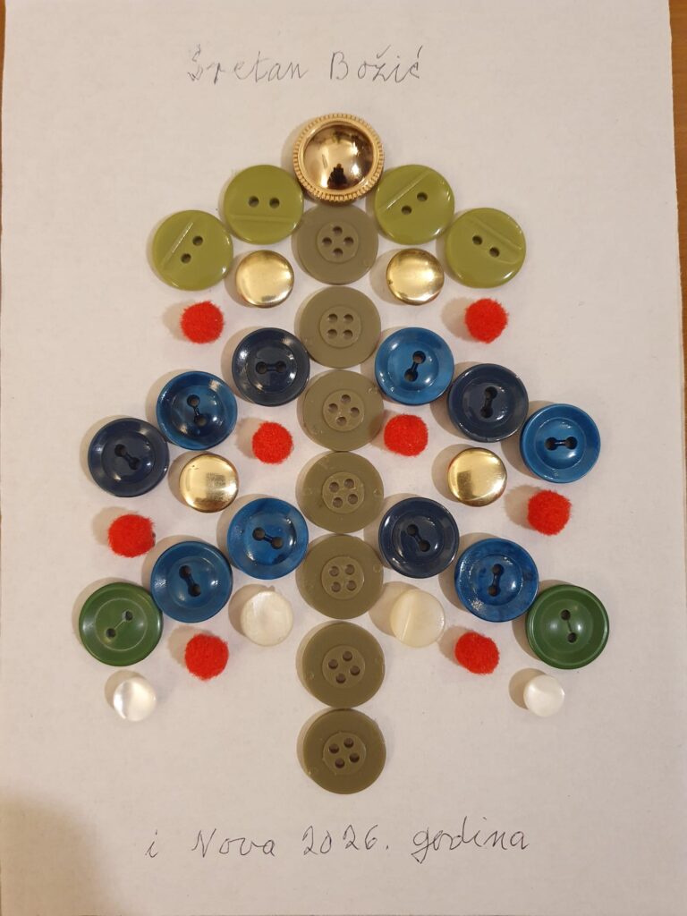Želje za novu godinu 26. prosinca 2025. Marija Toplak, sestra naše dugogodišnje i dugovječne članice Zore Heide, šalje dobre želje za 2026. Ovu jelu od dugmadi sama je izradila u 10. desetljeću!
